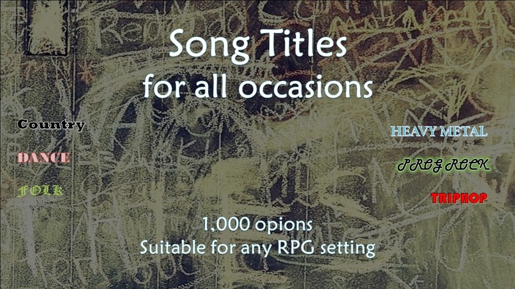 When providing a new option for your roleplay group, be it a scenario, scene, or a random encounter, this book offers a new way to tap into the Games Master’s (GM) creative juices. Using real song titles as inspiration can offer a hint of what to expect or unexpected themes to keep everyone on their toes.